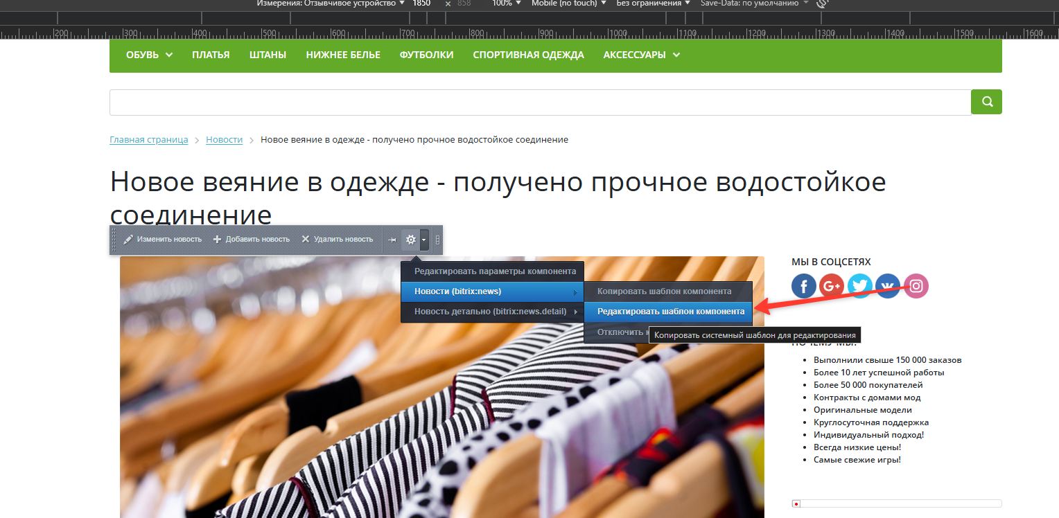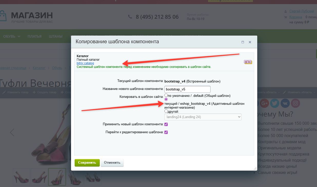Обратите внимание! Системный шаблон не подлежит редактированию Перед редактированием нужно перенести шаблон компонента в текущий шаблон сайта.