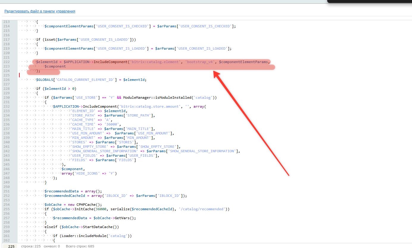 В этом файле нужно найти строку с подключением компонента bitrix:catalog.element