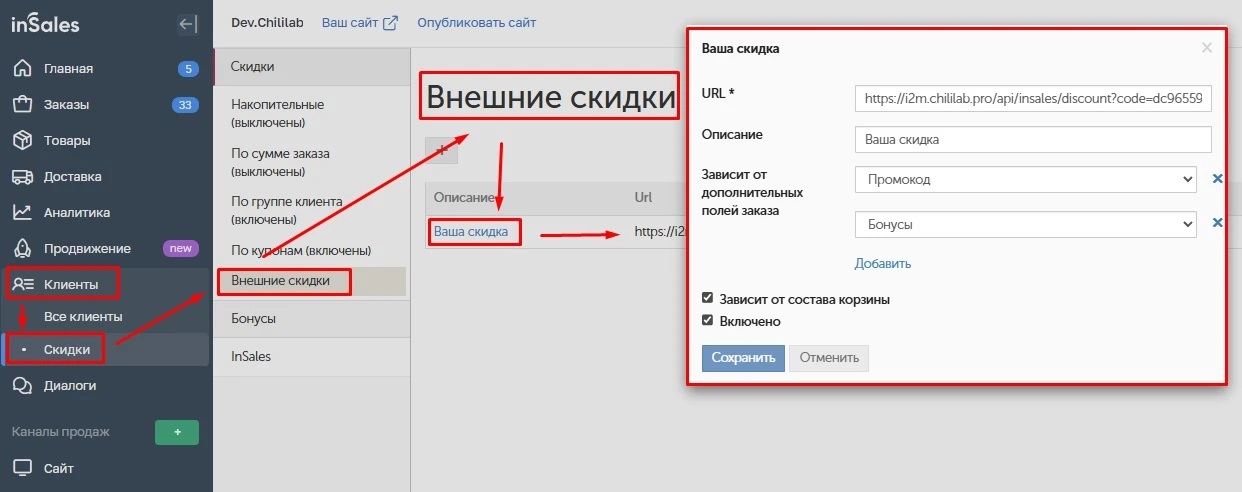 Не нужно вносить изменения в раздел «Внешняя скидка» административной панель Insales. В данном разделе, после установки приложения автоматически создается вкладка «Скидка Maxma», и корректировать данный раздел не следует, так как это влияет на работоспособность сервиса в целом.