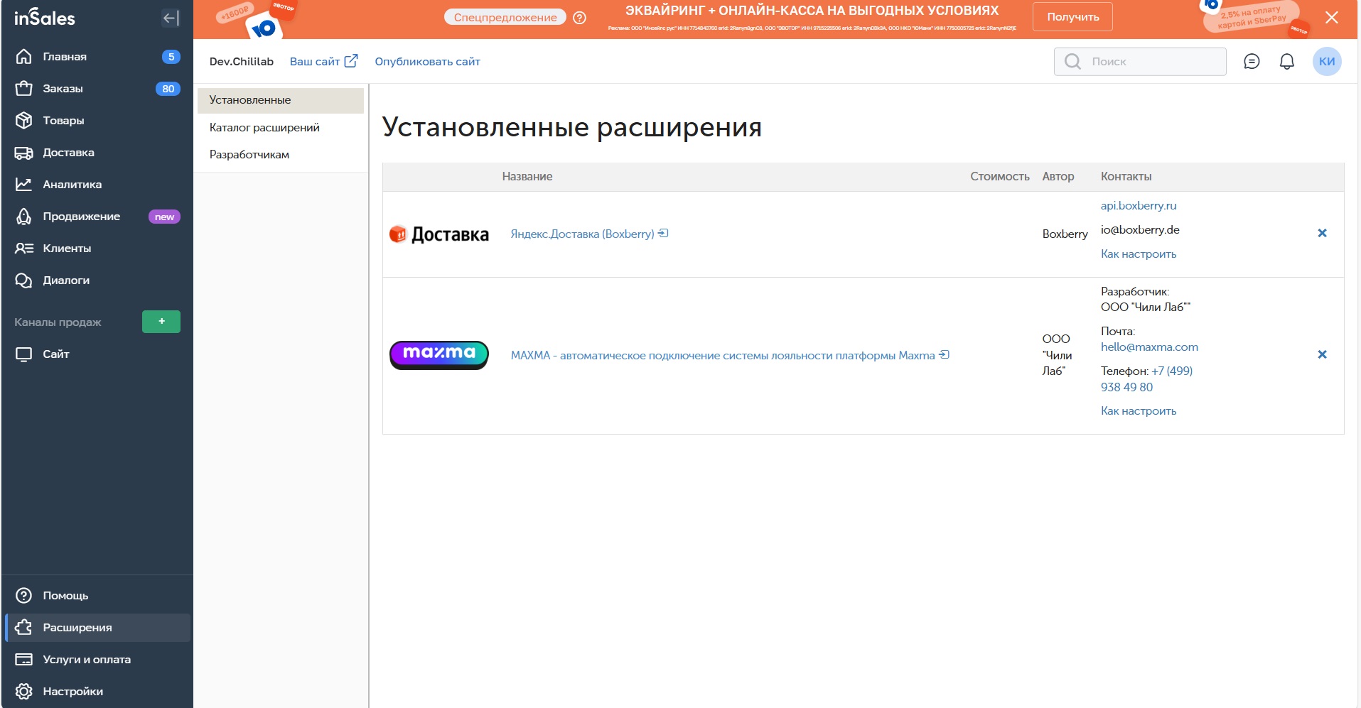 1. В административной панели Insales зайдите в раздел «Расширения». Далее во вкладку «Каталог расширений»